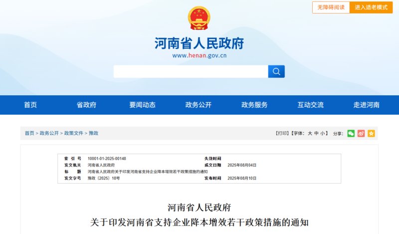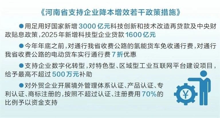减税降费、财政贴息、技术改造、转型升级……降本增效不仅直接关乎企业的盈利能力和市场竞争力,也深刻影响一个地区的内部经济活力和外部投资吸引力。记者了解到,省政府近日印发《河南省支持企业降本增效若干政策措施》(以下简称《措施》),从研发、资金、用能、物流、人力等十个方面推出20项干货满满的举措,助力企业降本增效。